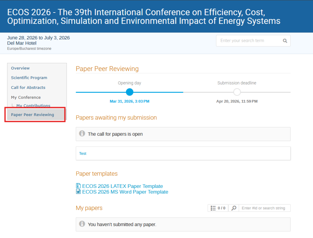 Papers can be submitted by going to the respective contribution under “Papers awaiting my submission“, in this image it has the title “Test”. Already submitted papers will appear under the “My papers” section.